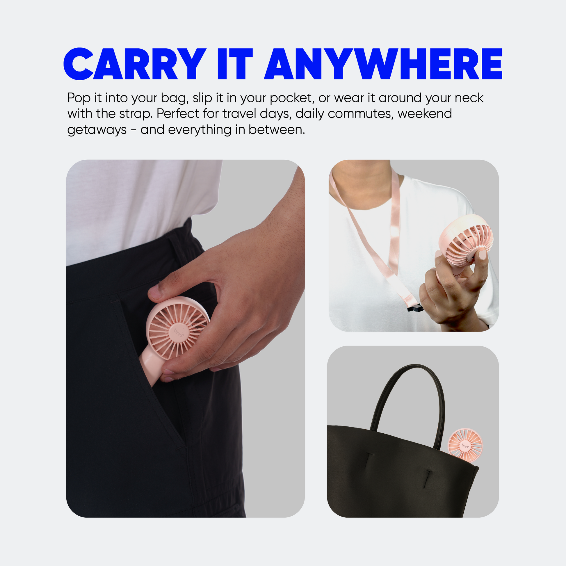- This small yet powerful fan can be carried anywhere. It can fit in your pocket or bag.