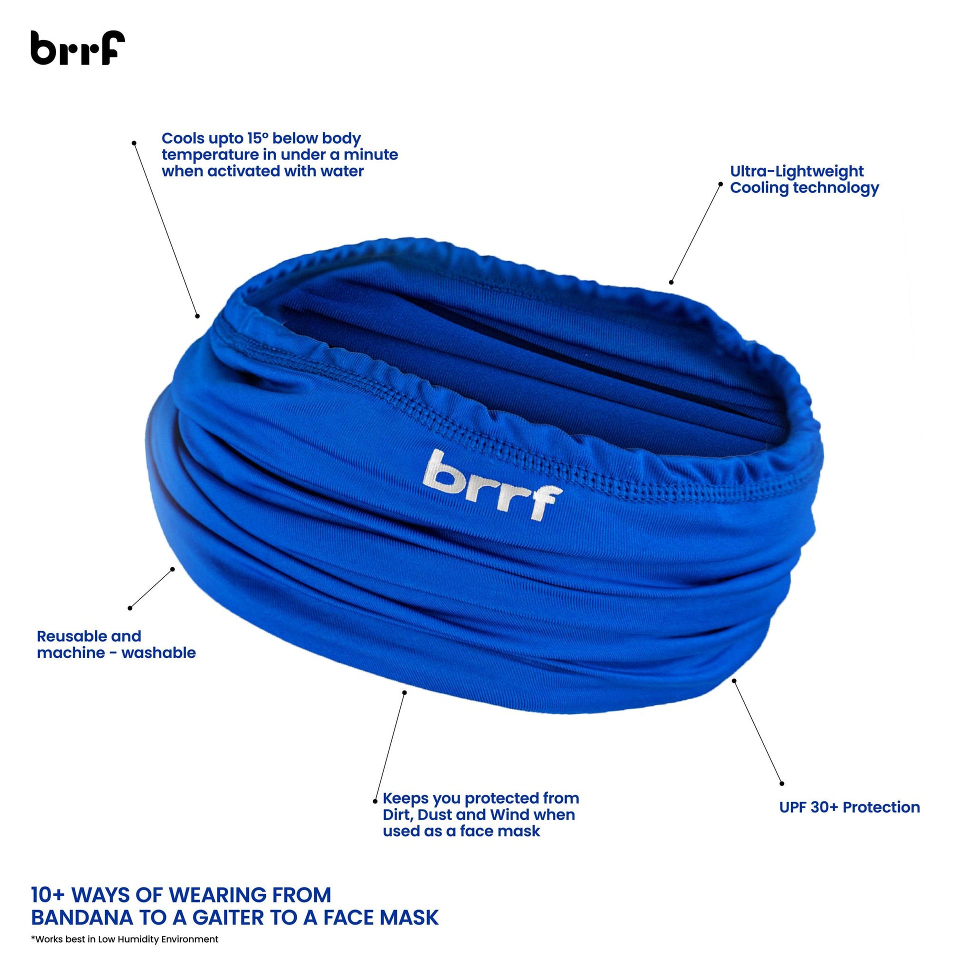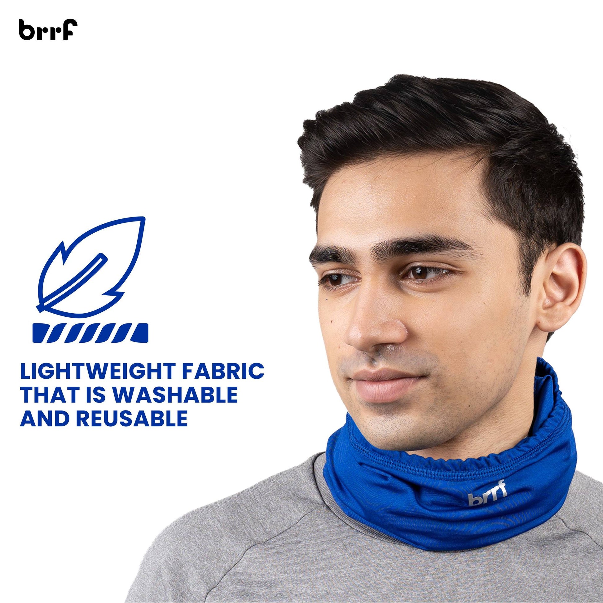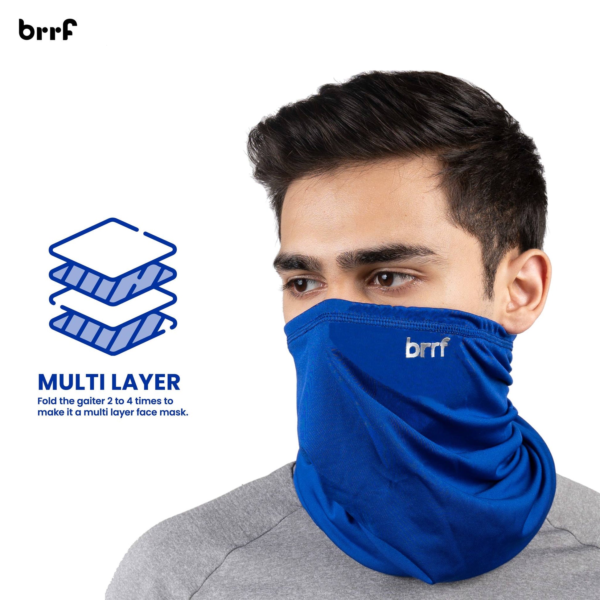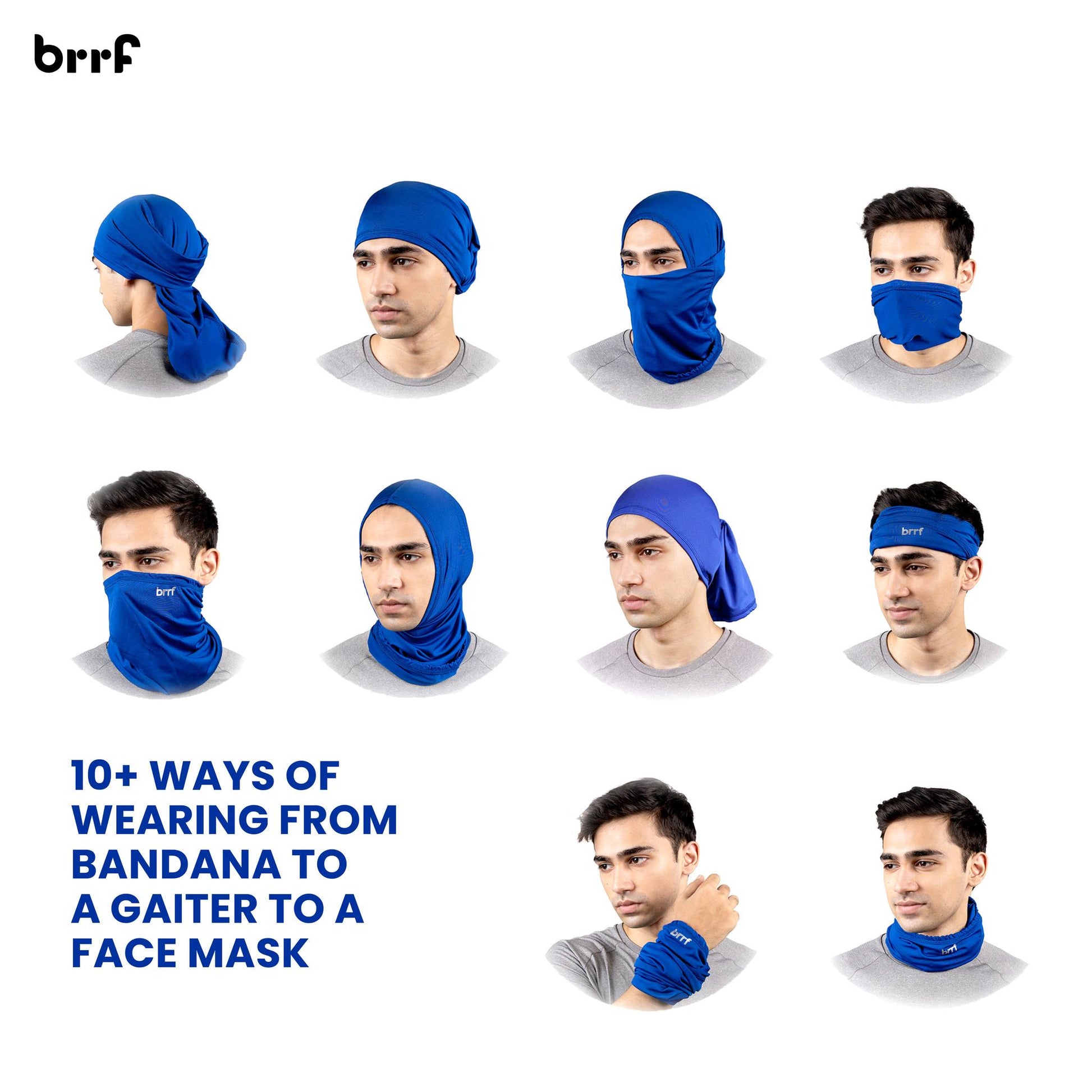 Brrf Cooling Gaiter can be worn in 10+ styles to protect from various outdoor elements. Wear as Neck Gaiter, Face Mask, Headband, Helmet Liner, Headwrap, Skull Cap, Bandana, Wrist band, and more. Can adjust the gaiter to wear as a 4 layer mask as well -